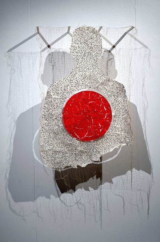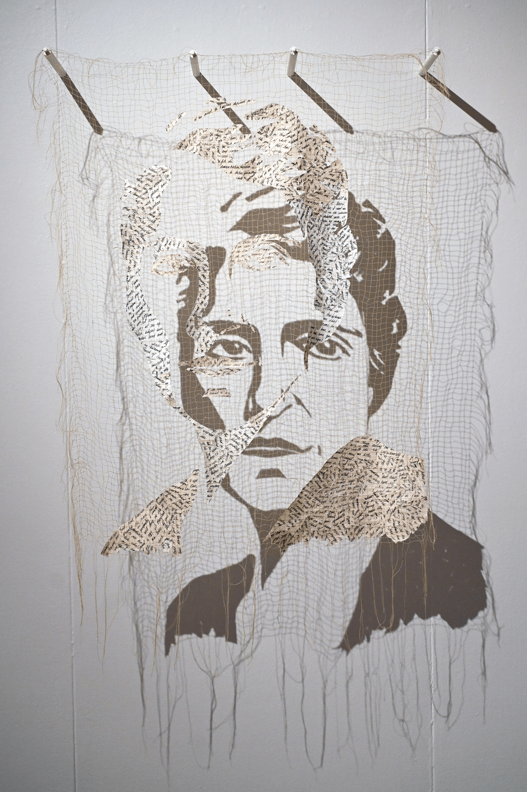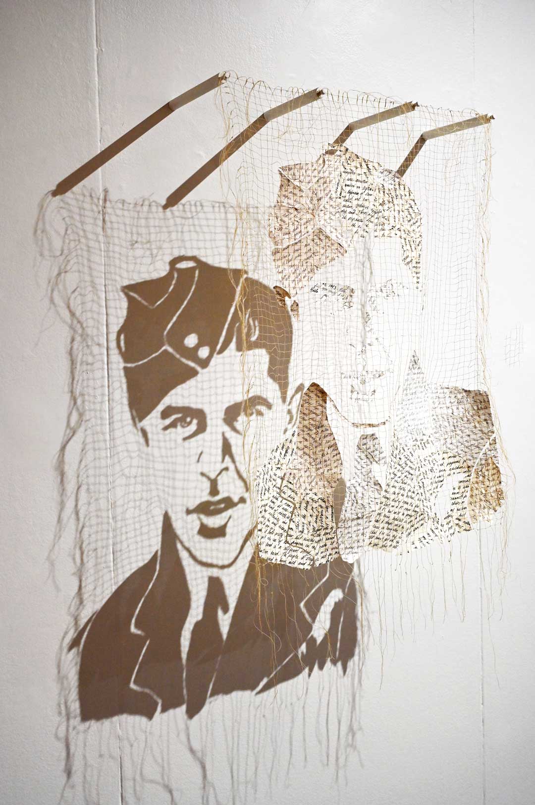 To build this series, I transcribed the letters my grandmother wrote on paper made by my aunt. (she gave me her stash of handmade paper shortly before she died). After transcribing the letters, I tore/cut them and stitched them together to create portraits of my grandparents, my five uncles and the red target that was stitched to the back of each internee’s uniform. When light is cast upon these delicate, monochromatic tapesties, a detailed shadow appears like a ghost from the past. This process of making, allows me to go back to that time, empathize with my family, forgive, and perhaps let go of any lingering trauma.
